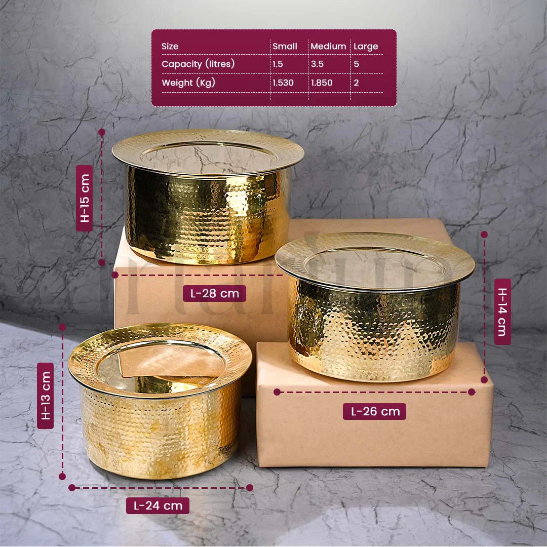 The brass bhagona/patila is a multipurpose cooking vessel perfect for boiling, simmering, or preparing large meals. Its wide base ensures even cooking, while the durable brass material provides excellent heat retention. From boiling milk to making soups or festive dishes, this traditional cookware is designed for versatile use. Its timeless appeal and functional design make it a valuable addition to any kitchen.
