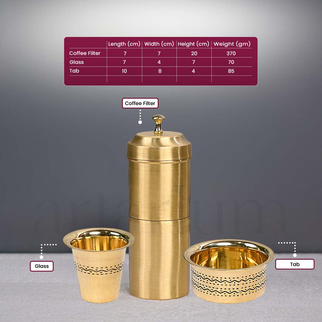 Celebrate the traditional way of enjoying filter coffee with this brass filter coffee and dabara set. Designed for coffee lovers, this set brings the charm of authentic South Indian culture to your table. The brass material ensures durability and heat retention, making it perfect for enjoying hot beverages. Its classic design is both functional and visually appealing, making it ideal for serving coffee to family or guests. Easy to use and clean, it’s a must-have for coffee lovers who appreciate tradition and quality