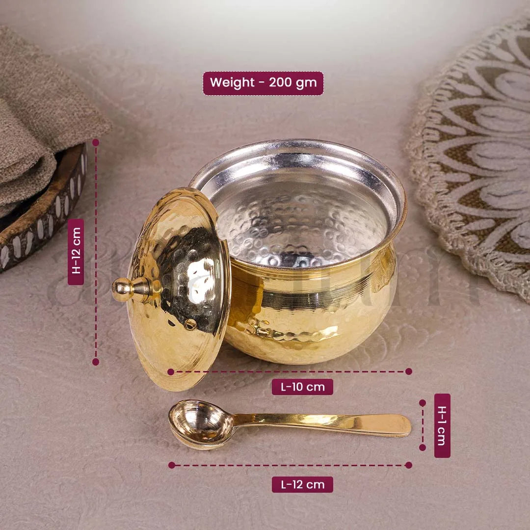 The premium Brass Hammered Ghee Pot with Spoon and Lid is as functional as it is beautiful. The hammered texture adds a traditional, vintage charm, while the snug-fitting lid ensures your ghee stays fresh, aromatic, and protected from harmful elements. Here you also get a small brass spoon that makes it convenient to scoop just the right amount for your tadka, rotis, or desserts. Ideal for everyday use, this brass cookware is a must-have addition to your kitchen essentials.