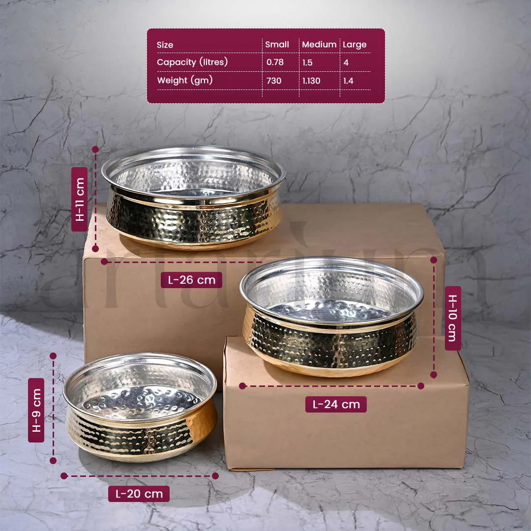 The brass lagan with kalai is a must-have for anyone who loves traditional cooking. Perfect for slow-cooked meals like biryanis, stews, or festive dishes, this wide, heavy-bottomed utensil ensures even heat distribution for perfect results. Lined with food-safe kalai, it combines health-conscious cooking with durability. Its robust brass construction provides excellent heat retention, while the wide surface makes stirring and mixing easy.