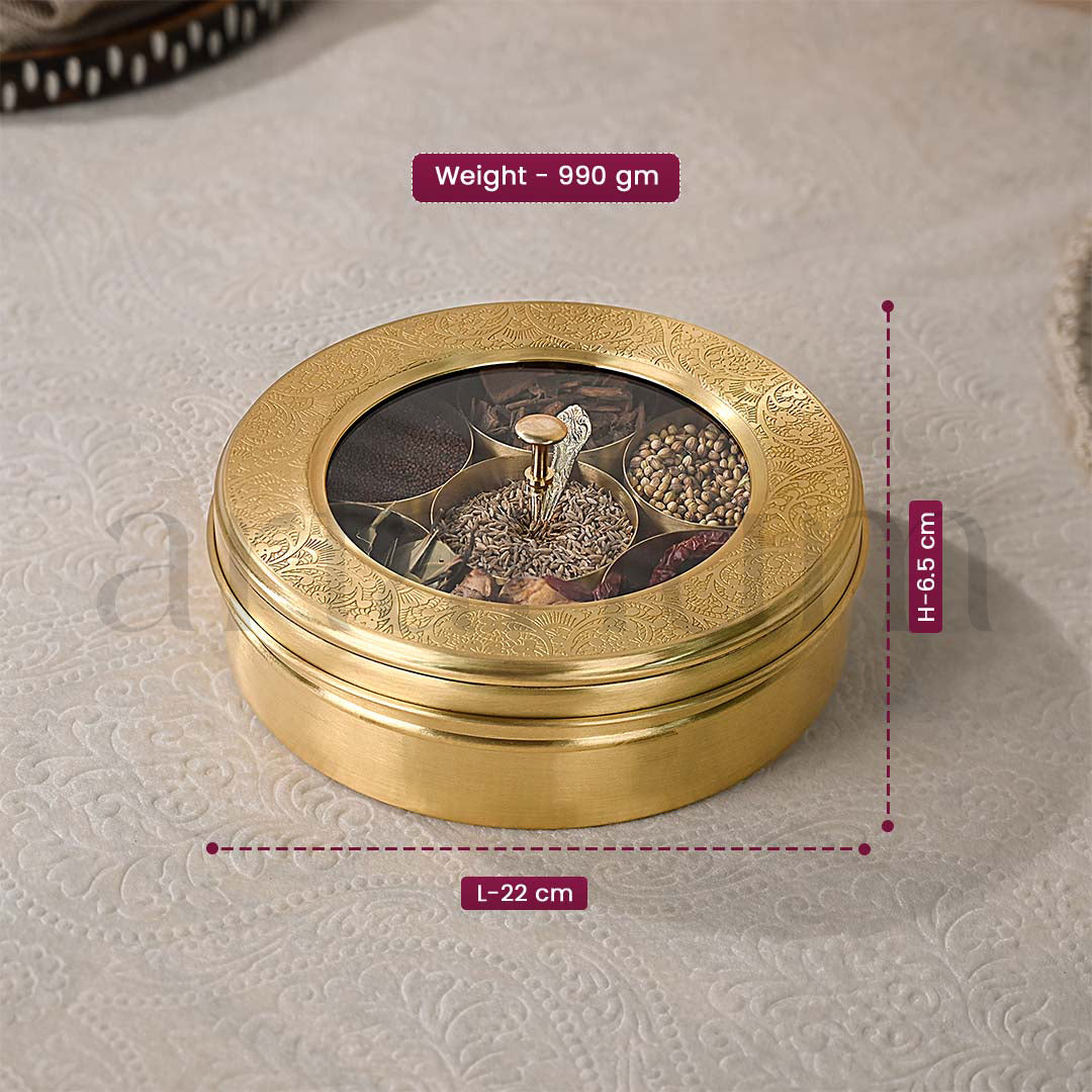 A well-organized spice box is a must-have for every kitchen, and the brass masala box with a see-through lid offers the perfect solution. Its practical design allows you to store and easily access your favorite spices, while the transparent lid saves you time by showing what’s inside at a glance. Made from durable brass, this masala box is built to last and ensures your spices stay fresh and ready to use.