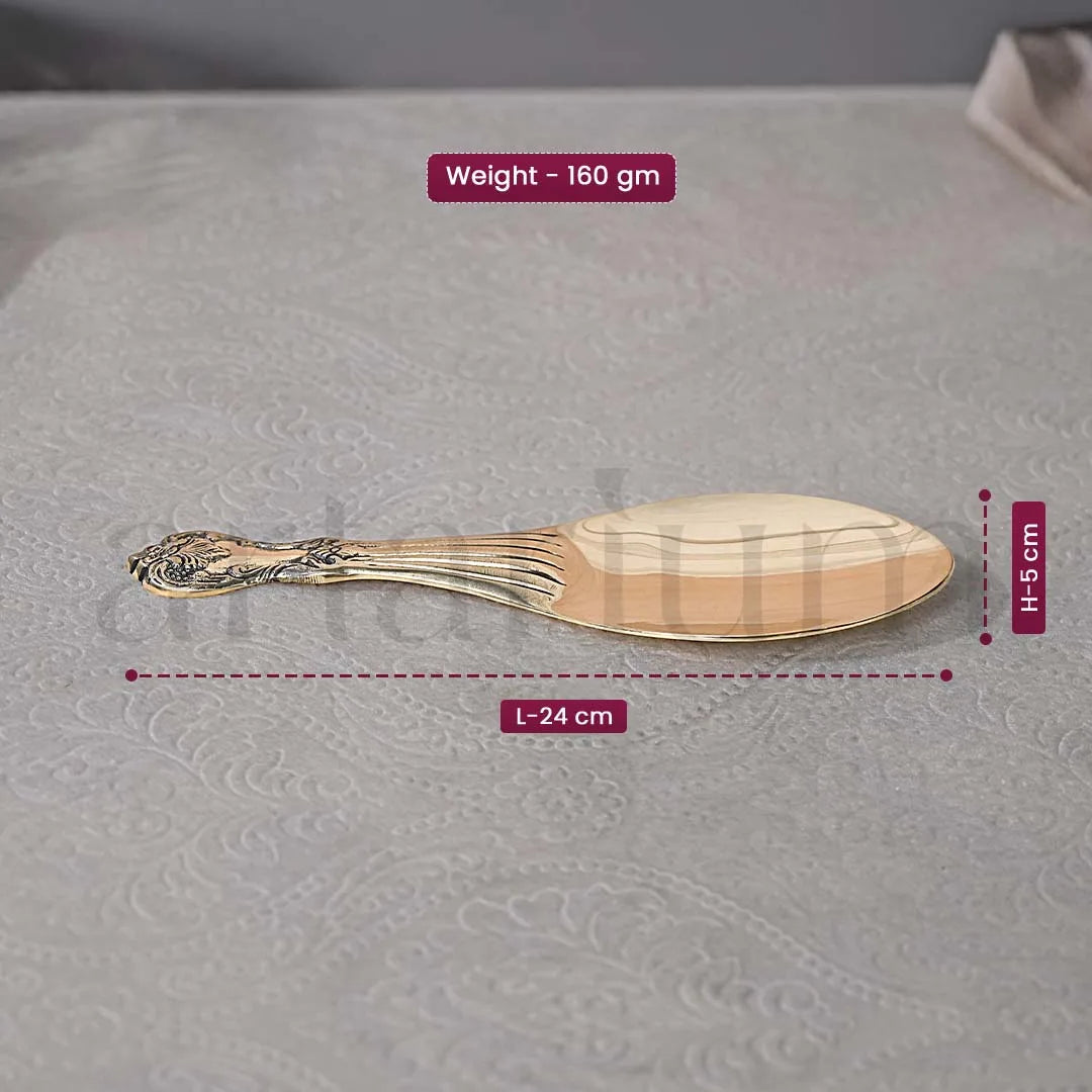 The Brass Serving Spoon is the perfect addition to your everyday dining experience. From serving steaming hot rice, aromatic biryani, or pulao, this spoon makes serving easy and mess-free. The sturdy design ensures a comfortable grip, so you can use it every day without worry. And likewise other brass utensils, the best part of this serving spoon is its classic golden finish that adds a touch of tradition and elegance to your daily meals and festive feasts.