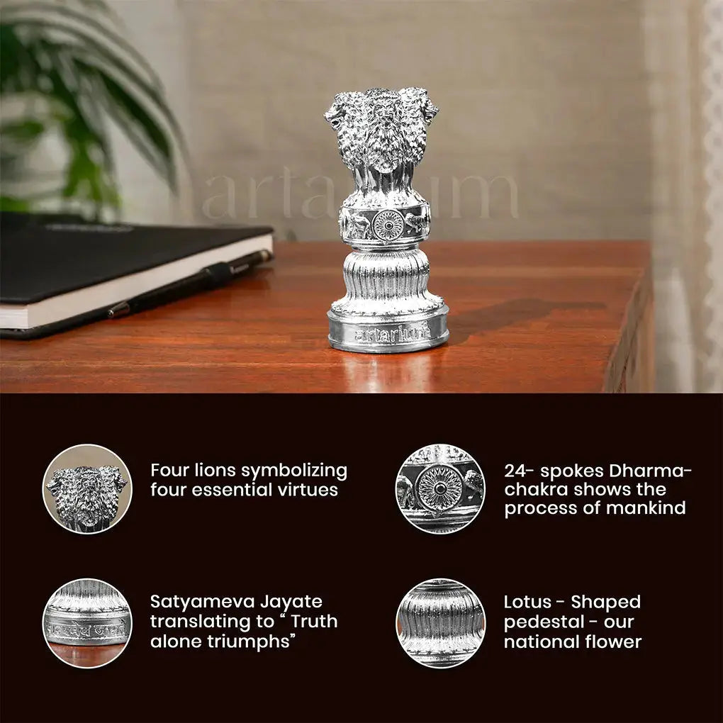 It has a timeless shine and a dignified presence thanks to its expertly crafted handiwork and brilliant silver-plated finish. The base engraved with "Satyameva Jayate" and the finely detailed Dharmachakra serve as a constant reminder that only truth prevails. This statue adds cultural significance and pride to any area, making it perfect for desks, offices, or as a heartfelt gift.