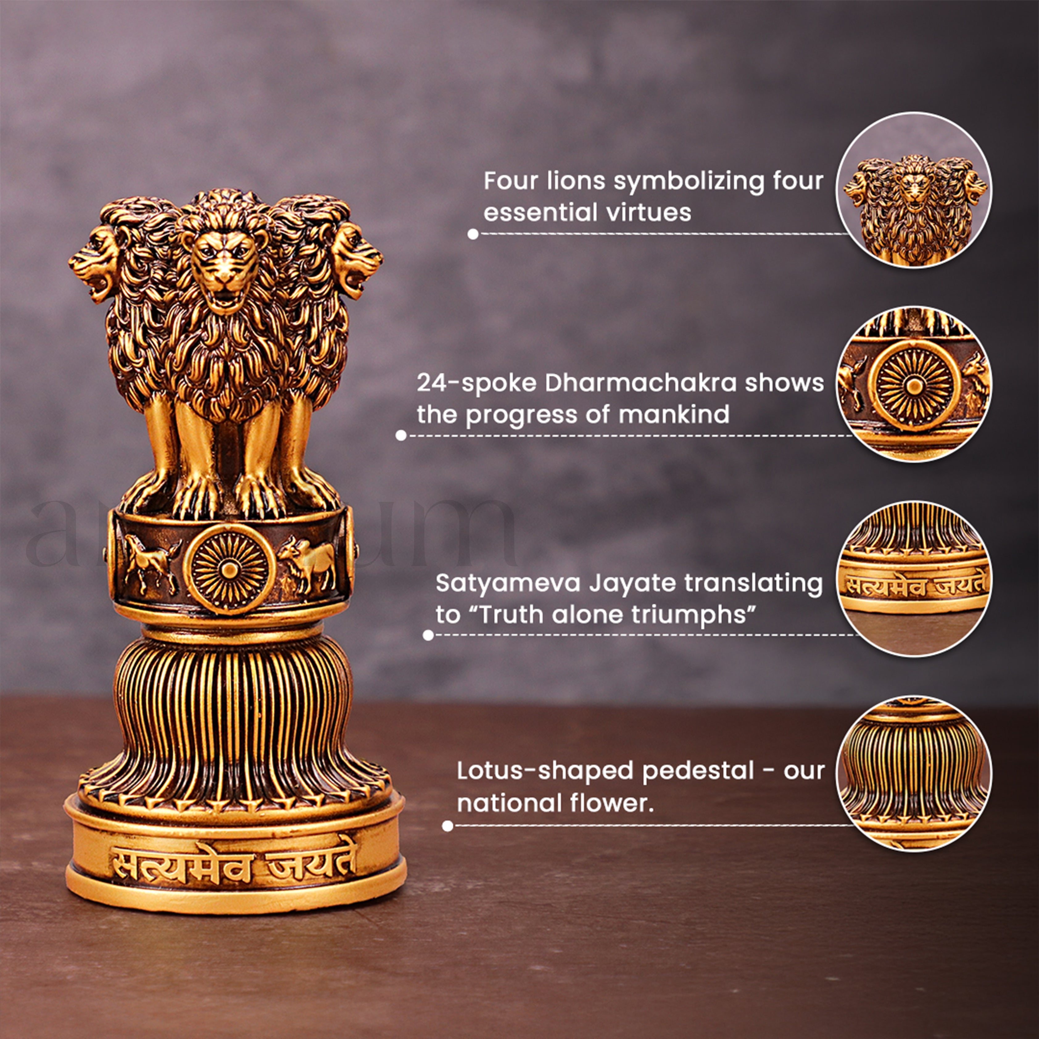 The Ashok Stambh is an icon of Indian heritage and a beacon for a promising future of the country. Our Ashok Stambh Statue precisely recreates the famous sculpture in high-grade materials and an antique polish.