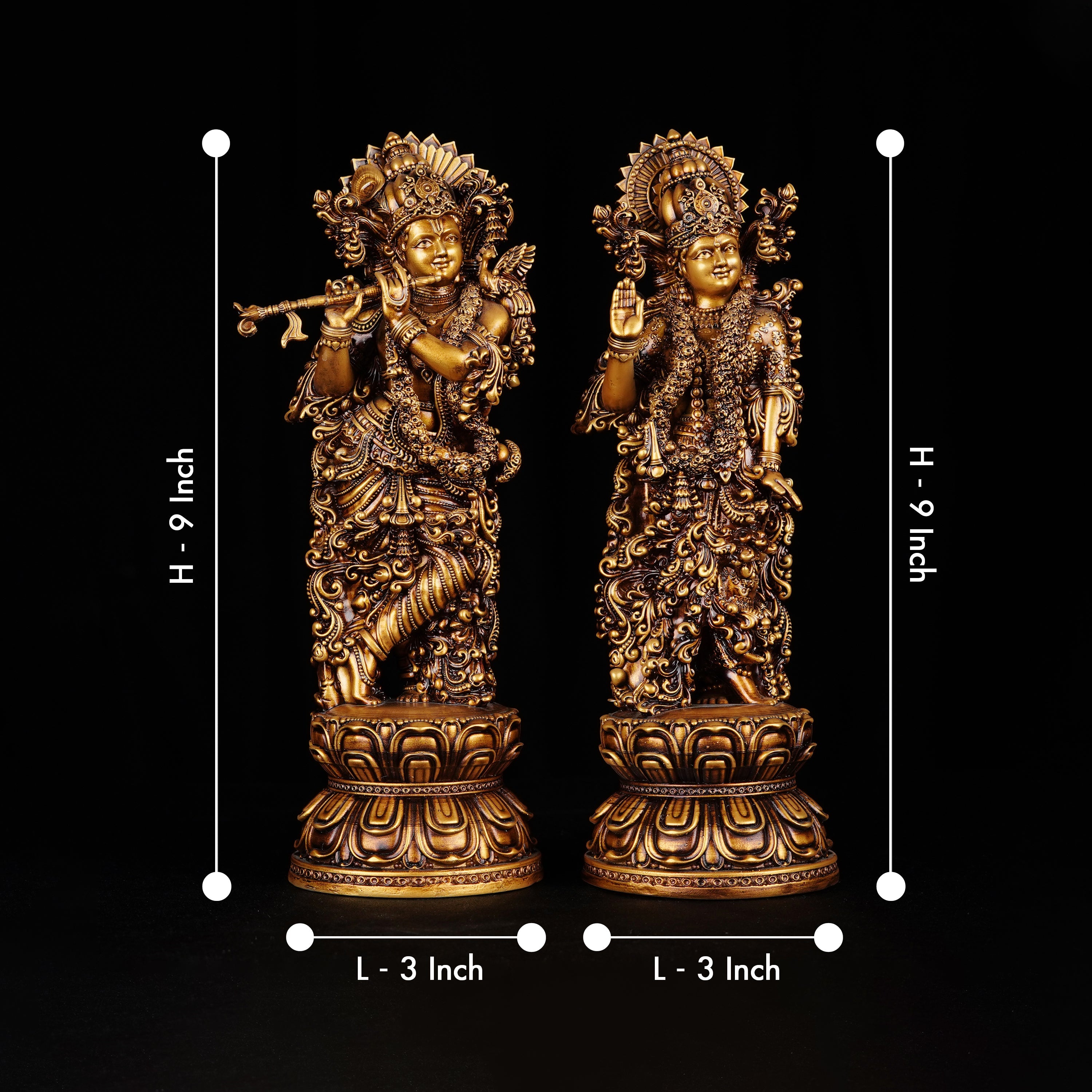 Shree Krishna idol beautifully portrays the divine couple in an iconic stance: Krishna playing the flute while Radha stands gracefully by his side, captivated by the melody. This depiction symbolises their profound spiritual connection, where Krishna's music embodies the sound of the cosmos and the union of the individual soul with the universal spirit.