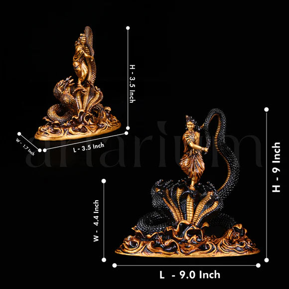 Invite divine charm and positivity into your space with the Dancing Krishna Idol. This intricately crafted piece depicts the legendary moment from Hindu mythology when young Lord Krishna triumphed over the serpent Kaliya, showcasing his divine strength and grace. Designed to capture the fluidity of Krishna's dance and the dramatic energy of the defeated serpent, this idol is a true representation of art and spirituality.
