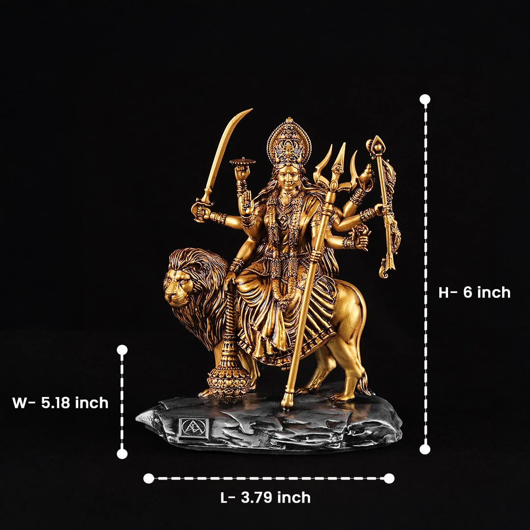 Upgrade your home or any space with The Artarium’s goddess durga idol, a perfect blend of divine grace and artistic craftsmanship. This beautifully handcrafted statue captures Goddess Durga in her iconic pose, seated on her majestic lion, symbolizing strength and protection. With her right hand raised in blessing and holding her sacred weapons - the Trishul, Sword, Chakra, Mace, and Bow - this idol is designed to inspire positivity, courage, and peace.