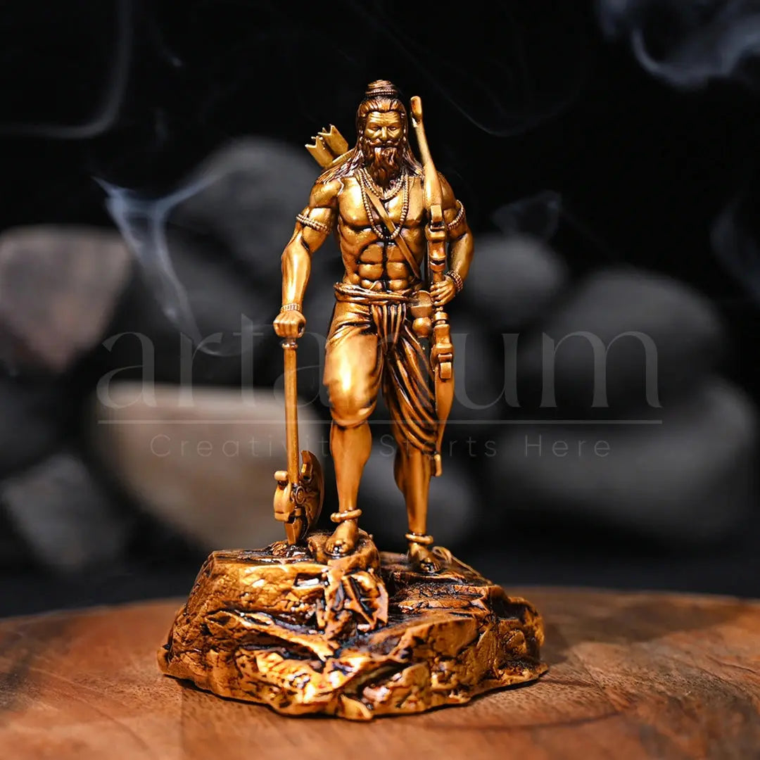 The ascetic, warrior, and revered Brahmin are all eloquently reflected in the Lord Parshuram idol. The figure, which has matted hair and is holding his famous axe Vidyudabhi and the Vijay Dhanush, is incredibly detailed in every way. He represents bravery and tenacity and is shown standing in a dominant position atop a rock pedestal. This Parshuram murti, enhanced with exquisite carvings and an antique finish, is a timeless piece that adds spiritual significance to your home.