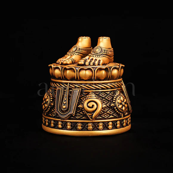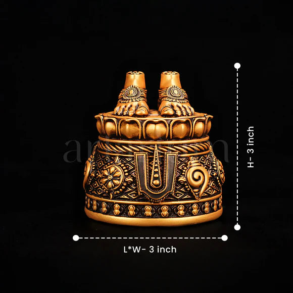 With the Tirupati Balaji Charan Paduka, a revered representation of the Lord's holy footprints that brings harmony and wealth into any area, you can experience divine grace. Perched atop a padded pedestal, it represents the Lord's dominion over the material world. From the elaborate carvings on the base to the decorations on the feet, every detail is exquisitely made. The shankh (conch shell), the divine chakra, and the auspicious Vaishnava Tilak complete the design. Crafted from premium materials, this divine symbol is a classic addition to any house.
