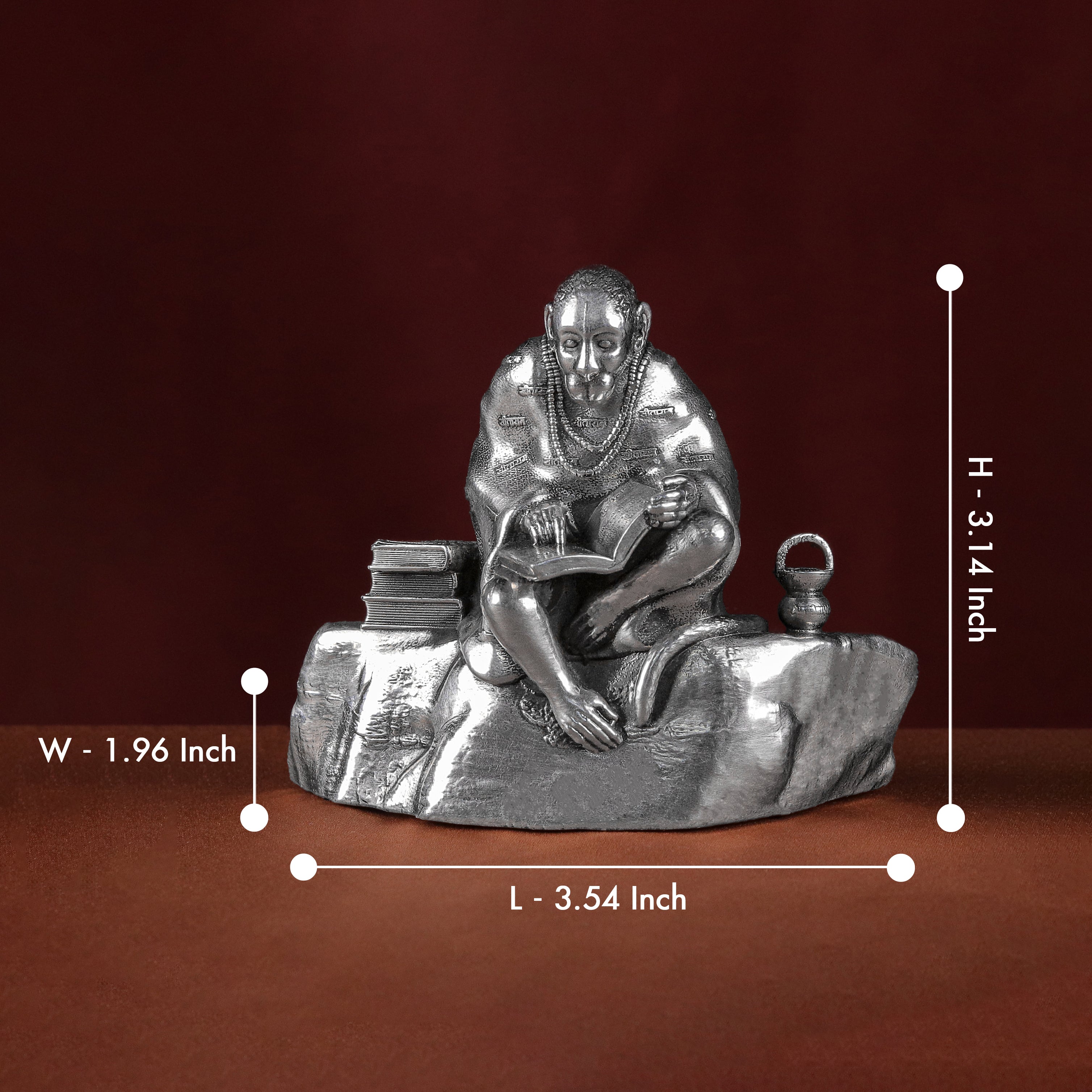 Introducing the Ramayani Lord Hanuman, made of pure silver. This exquisite figurine beautifully captures Hanuman Ji in a serene pose, seated on a stone pedestal, deeply engrossed in reciting the holy Ramayana.