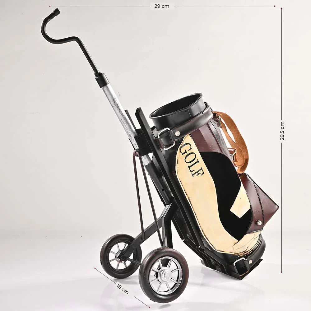 Embrace the spirit of classic golf with the Fairplay Golf Cart Bag. Inspired by the timeless design of vintage golf bags, this decor piece is crafted from high-quality metal and features intricate details, including leather-like straps, realistic wheels, and a sturdy handle. The aged finish lends a rustic charm, reminiscent of well-loved golf gear from days gone by.