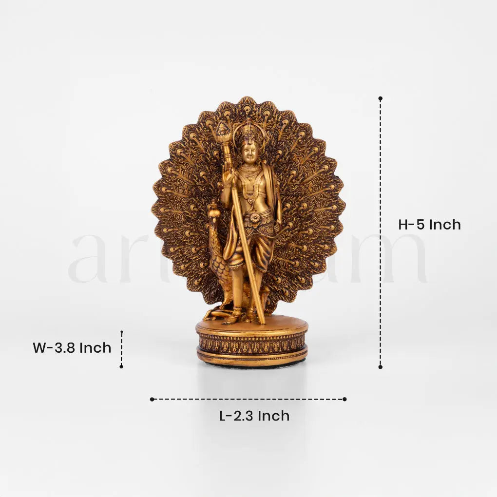 This beautiful idol embodies devotion and depicts Lord Murugan, the God of wisdom, bravery, and victory, in all his majesty. With his vahana, the peacock, spreading a beautiful display of feathers behind him, Murugan Swami, carved in the elegant tribhanga pose, stands in Abhay Mudra, radiating blessings and protection. The celestial spear, or vel, which he holds lightly, represents bravery, discernment, and divine wisdom.